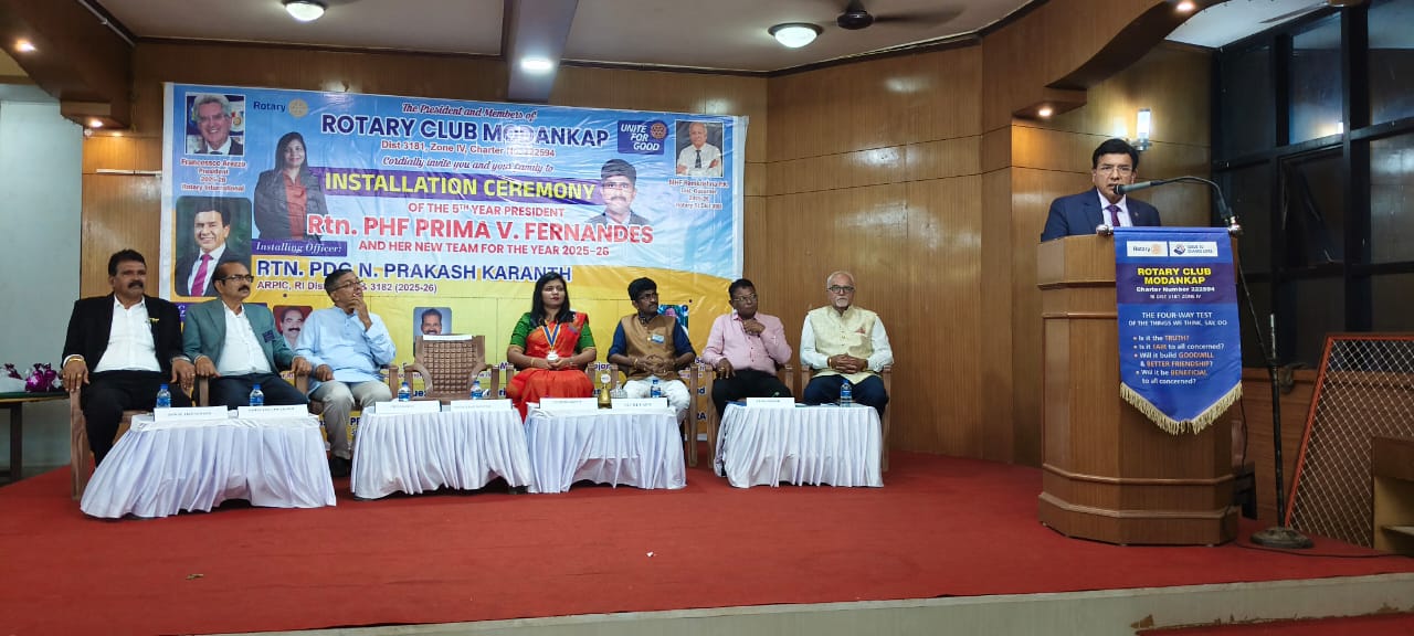 ಬಂಟ್ವಾಳ: ರೋಟರಿ ಕ್ಲಬ್ ಮೊಡಂಕಾಪು ಇದರ 2025-26ನೇ ಸಾಲಿನ ನೂತನ ಅಧ್ಯಕ್ಷೆ ಪ್ರೀಮಾ ವಿ. ಫೆರ್ನಾಂಡೀಸ್ ಹಾಗೂ ಪದಾಧಿಕಾರಿಗಳ ಪದಗ್ರಹಣ ಸಮಾರಂಭ ಬಿ.ಸಿ.ರೋಡಿನ ಕೈಕಂಬದ ಸೂರ್ಯವಂಶ ಕಟ್ಟಡದ ಕೆ.ಎಲ್.ರಾವ್ ಮೆಮೋರಿಯಲ್ ಹಾಲ್ ನಲ್ಲಿ ನಡೆಯಿತು.