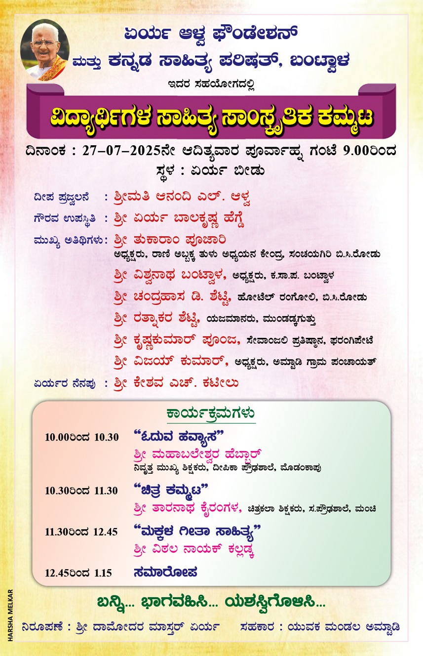 ಏರ್ಯ ಜನ್ಮಶತಮಾನೋತ್ಸವದ ಕಾರ್ಯಕ್ರಮದ ಪೂರ್ವಭಾವಿಯಾಗಿ ಜುಲೈ 27ರಂದು ಏರ್ಯಬೀಡುವಿನಲ್ಲಿ ವಿದ್ಯಾರ್ಥಿಗಳ ಸಾಹಿತ್ಯ ಸಾಂಸ್ಕೃತಿಕ ಕಮ್ಮಟ ನಡೆಯಲಿದೆ. ಆ ದಿನ ಬೆಳಿಗ್ಗೆ 9ಕ್ಕೆ ಏರ್ಯ ಲಕ್ಷ್ಮಿನಾರಾಯಣ ಆಳ್ವ ಅವರ ಪತ್ನಿ ಆನಂದಿ ಎಲ್.ಆಳ್ವ ದೀಪ ಪ್ರಜ್ವಲಿಸುವರು, ಏರ್ಯ ಬಾಲಕೃಷ್ಣ ಹೆಗ್ಡೆ ಗೌರವ ಉಪಸ್ಥಿತರಿರುವರು. ಮುಖ್ಯ ಅತಿಥಿಗಳಾಗಿ ಸಂಚಯಗಿರಿ ರಾಣಿ ಅಬ್ಬಕ್ಕ ತುಳು ಅಧ್ಯಯನ ಕೇಂದ್ರದ ಅಧ್ಯಕ್ಷ ಡಾ| ತುಕರಾಂ ಪೂಜಾರಿ, ಬಂಟ್ವಾಳ ಕಸಾಪ ಅಧ್ಯಕ್ಷ ವಿಶ್ವನಾಥ ಬಂಟ್ವಾಳ, ಹೊಟೇಲ್ ಉದ್ಯಮಿ ಚಂದ್ರಹಾಸ ಡಿ. ಶೆಟ್ಟಿ, ಮಂಡಡ್ಕಗುತ್ತು ಯಜಮಾನರಾದ ರತ್ನಾಕರ ಶೆಟ್ಟಿ, ಸೇವಾಂಜಲಿ ಪ್ರತಿಷ್ಠಾನದ ಆಡಳಿತ ಟ್ರಸ್ಟಿ ಕೃಷ್ಣಕುಮಾರ್ ಪೂಂಜ, ಅಮ್ಟಾಡಿ ಗ್ರಾ.ಪಂ. ವಿಜಯಕುಮಾರ್ ಭಾಗವಹಿಸುವರು. ಕೇಶವ ಎಚ್. ಕಟೀಲು ಏರ್ಯರ ನೆನೆಪು ವಿಷಯವಾಗಿ ಮಾತನಾಡಲಿದ್ದಾರೆ. ಕಾರ್ಯಕ್ರಮದಂಗವಾಗಿ ನಿವೃತ್ತ ಮುಖ್ಯಶಿಕ್ಷಕ ಮಹಾಬಲೇಶ್ವರ ಹೆಬ್ಬಾರ್ ಓದುವ ಹವ್ಯಾಸ, ಚಿತ್ರಕಲಾ ಶಿಕ್ಷಕ ತಾರನಾಥ ಕೈರಂಗಳ ಚಿತ್ರಕಮ್ಮಟ, ಶಿಕ್ಷಕ ವಿಠಲ ನಾಯಕ್ ಕಲ್ಲಡ್ಕ ಮಕ್ಕಳ ಗೀತಾ ಸಾಹಿತ್ಯ ಕಾರ್ಯಕ್ರಮ ನಡೆಸಿಕೊಡಲಿದ್ದಾರೆ. ಮಧ್ಯಾಹ್ನ 12.45ರಿಂದ ಸಮಾರೋಪ ಕಾರ್ಯಕ್ರಮ ನಡೆಯಲಿದೆ ಎಂದು ಅವರು ತಿಳಿಸಿದ್ದಾರೆ.